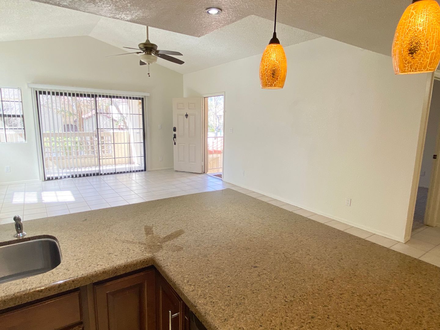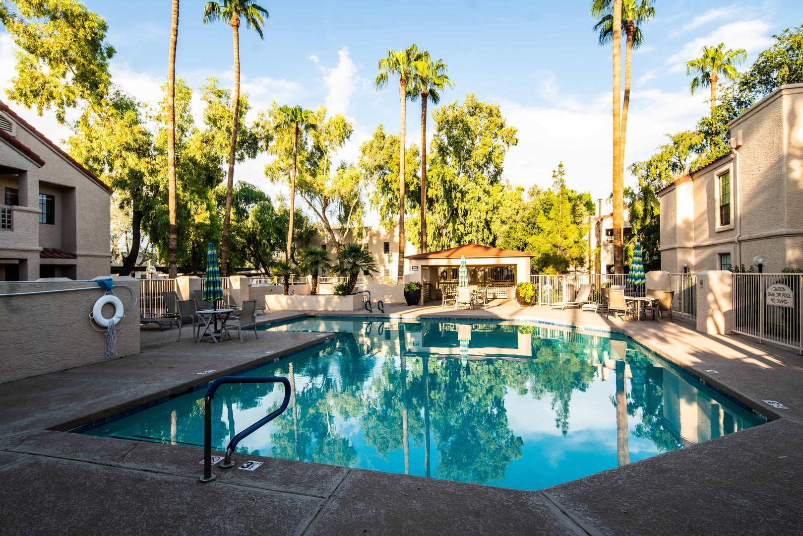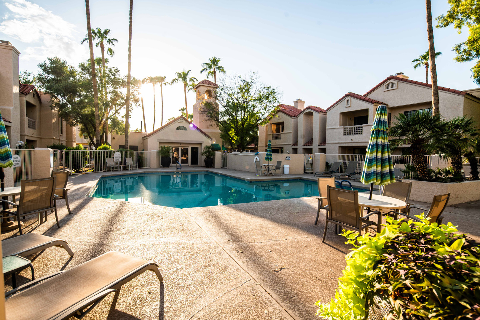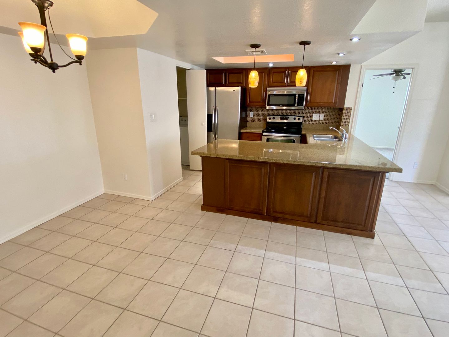 Spacious Mesa condo available now! High ceilings and great split floor plan. Flooring in main areas is tile and new carpet in the bedrooms, granite countertops in the kitchen, full size washer and dryer in unit, fully outfitted kitchen. Both bathrooms recently redone and new tile! The community is well maintained and beautifully landscaped, with a pool and spa, gas grills and exercise facility. The property is conveniently located near shopping, dining, and golf courses.