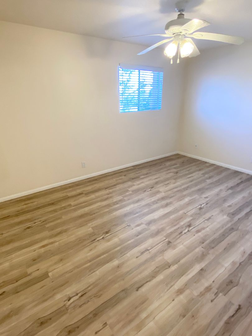 This two-story townhouse is a 2 bedroom, 1.5 bathroom unit. Newer vinyl flooring in living room and bedrooms. Ceiling fans in bedrooms and living room. Comes with one covered parking space and a storage unit. Small, gated patio area off dining area.