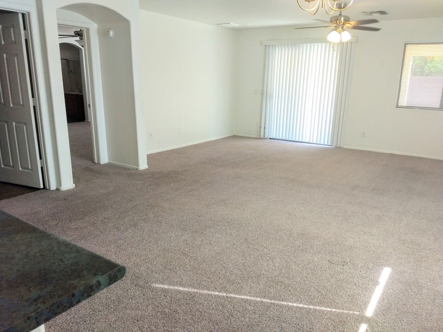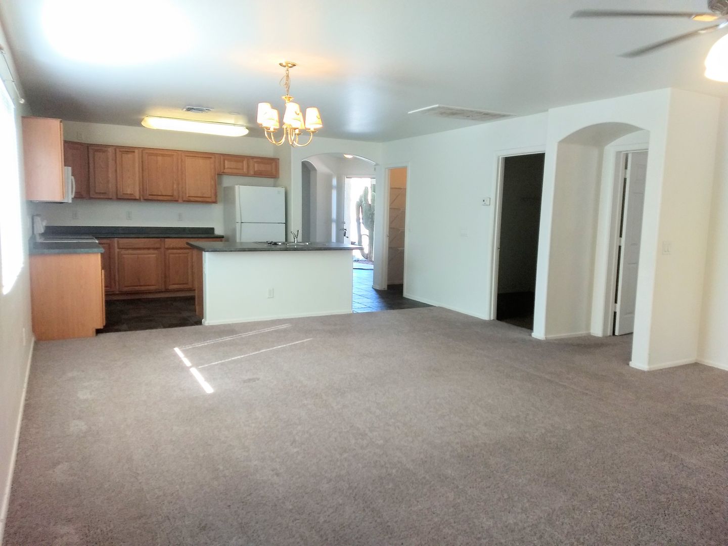 Single story, corner lot with LOTS of natural lighting in Rancho El Mirage. Fresh paint and new carpet throughout. Open kitchen/great room. Ceiling fans throughout to provide great air circulation. Landscaping gravel in front and back yard for lower maintenance/lower water usage landscaping. Two car garage. All appliances included except for a washer/dryer. This home is NOT pet friendly.